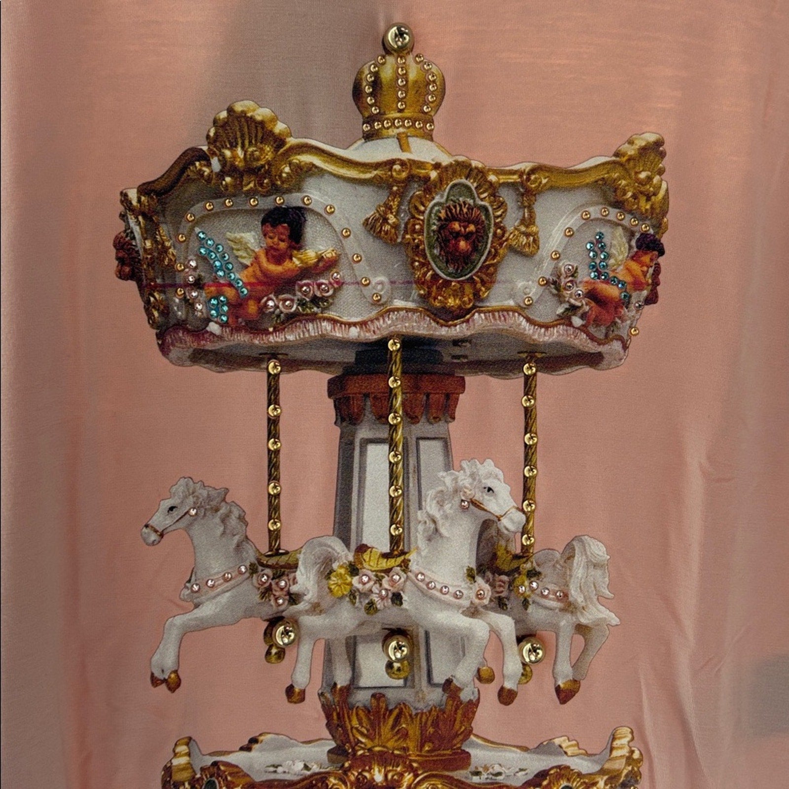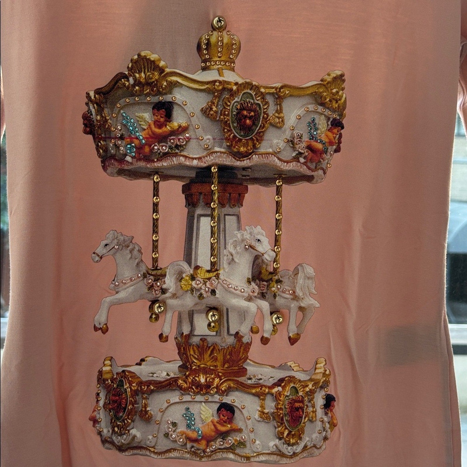This elegant blouse features a charming carousel print, perfect for adding a touch of whimsy to your wardrobe. The soft pink color enhances its feminine appeal. Ideal for casual outings or a day at the office.