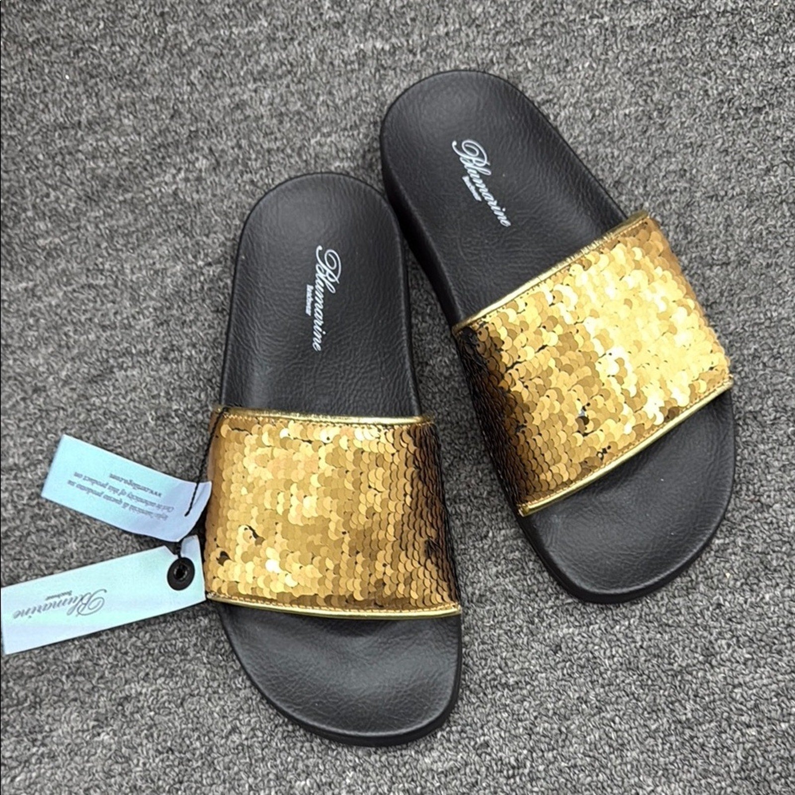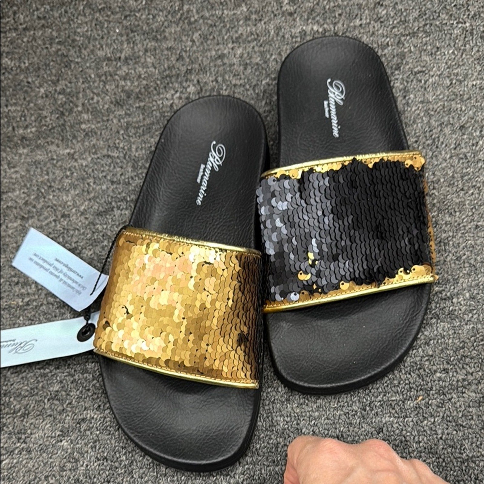 Step into style with these dazzling gold slide sandals. Perfect for adding a touch of glamour to any outfit. Slide your finger over the sequins to change to black!