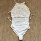 Elegant one-piece swimsuit by Blumarine. Features floral embroidery. Halter neck design with side ties.