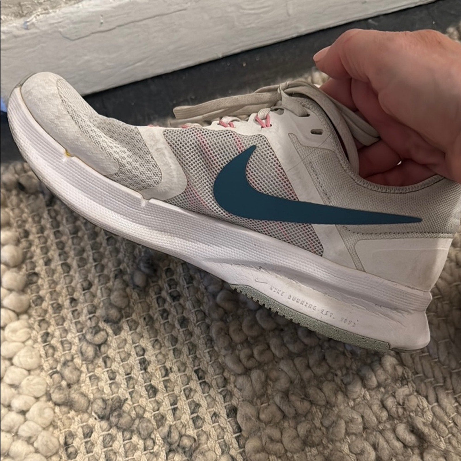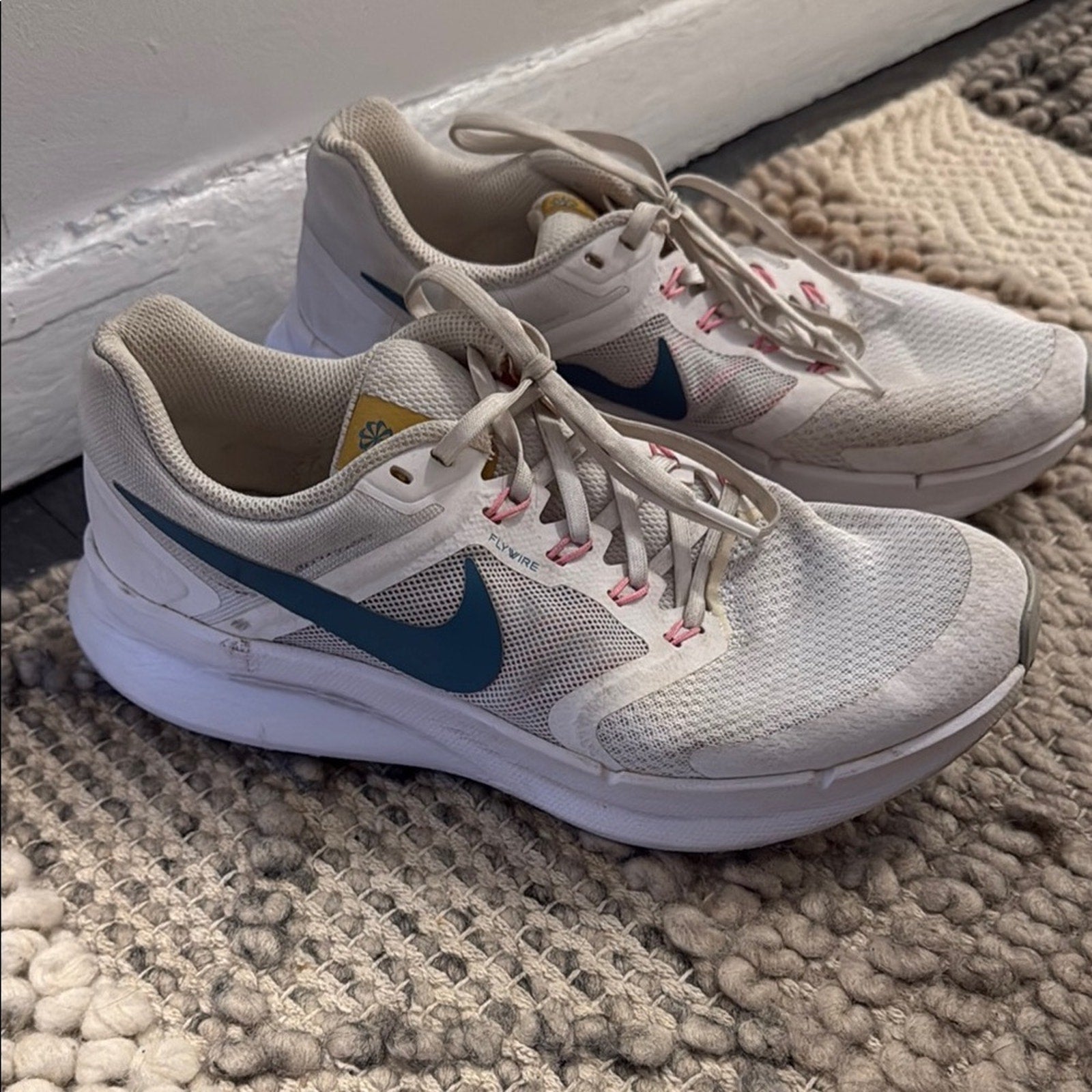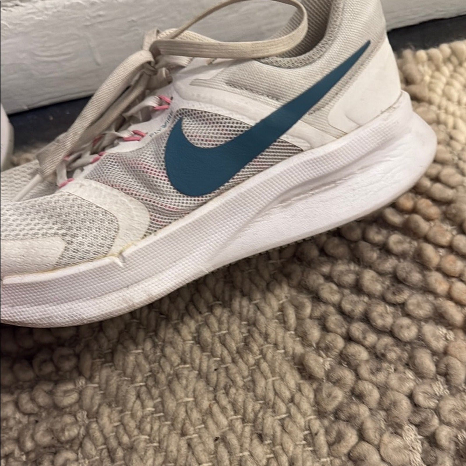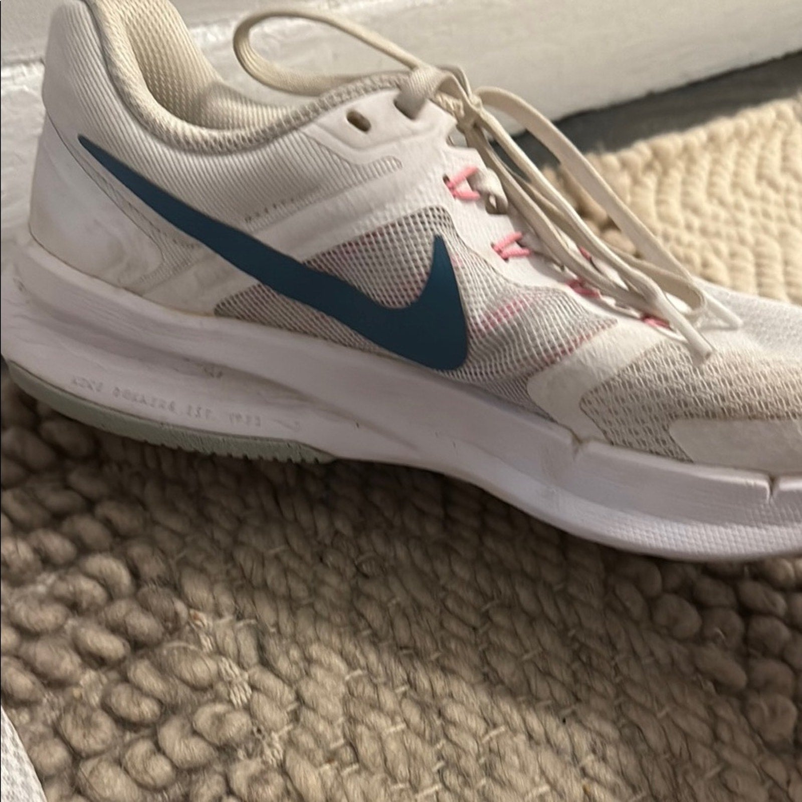 Step out in style with these Nike women's sneakers. Featuring a sleek white design with striking blue accents, these shoes offer both comfort and fashion. Perfect for everyday wear. Pink detailing. Some scuffs but still good condition.