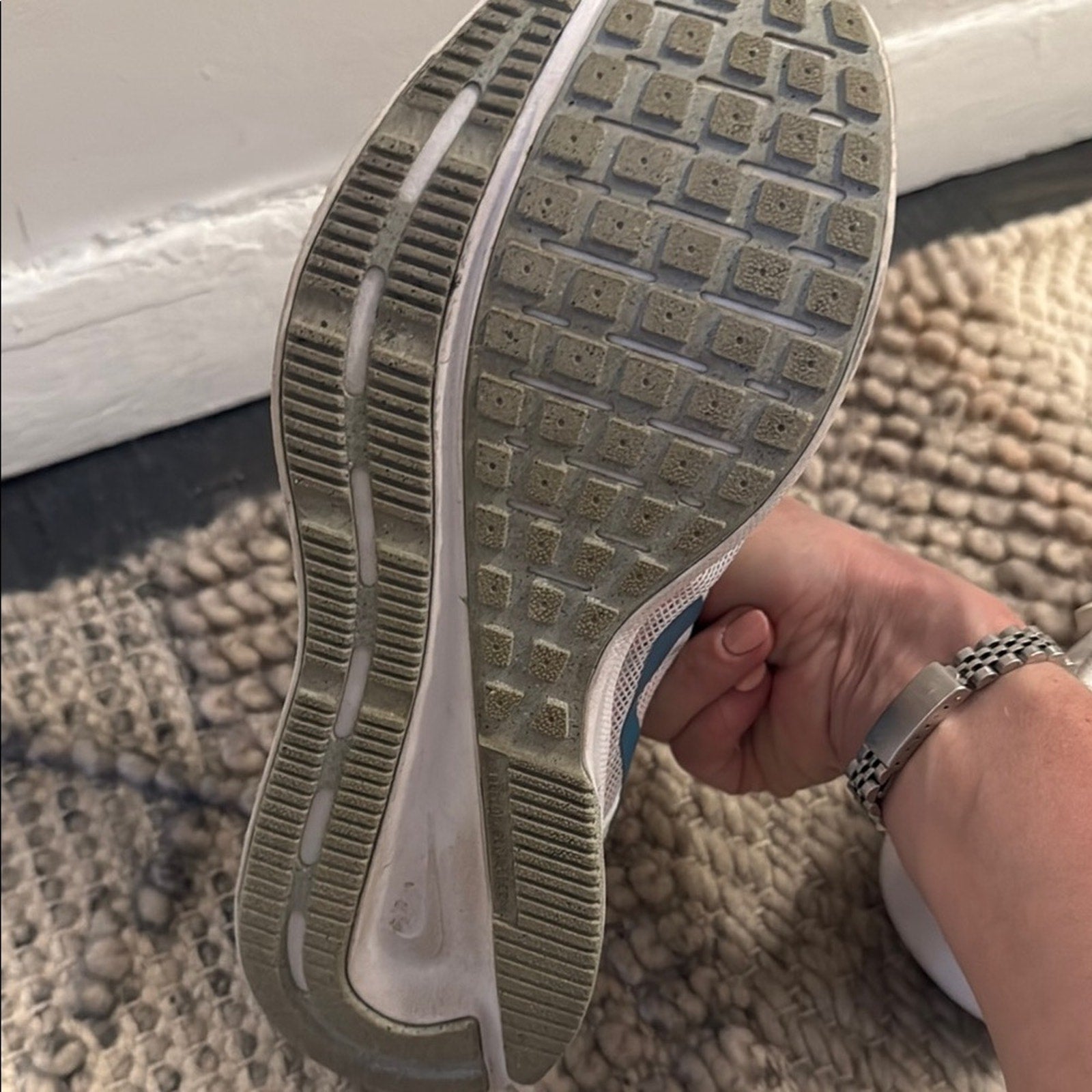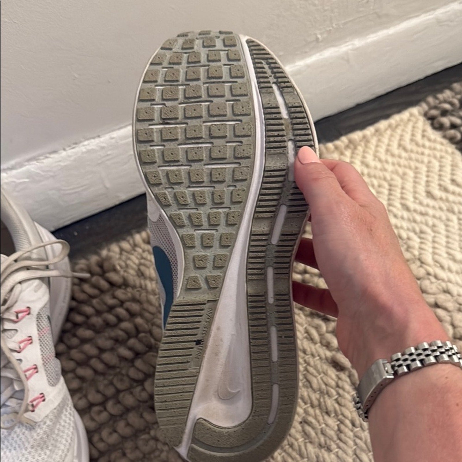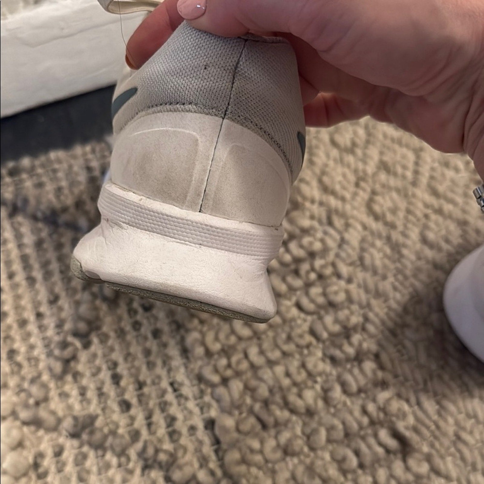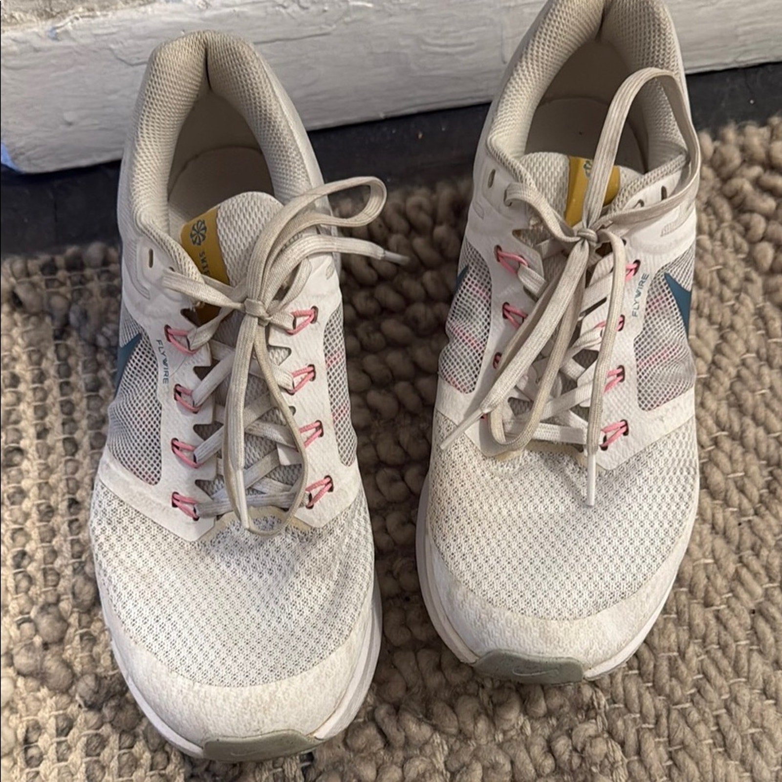 Step out in style with these Nike women's sneakers. Featuring a sleek white design with striking blue accents, these shoes offer both comfort and fashion. Perfect for everyday wear. Pink detailing. Some scuffs but still good condition.