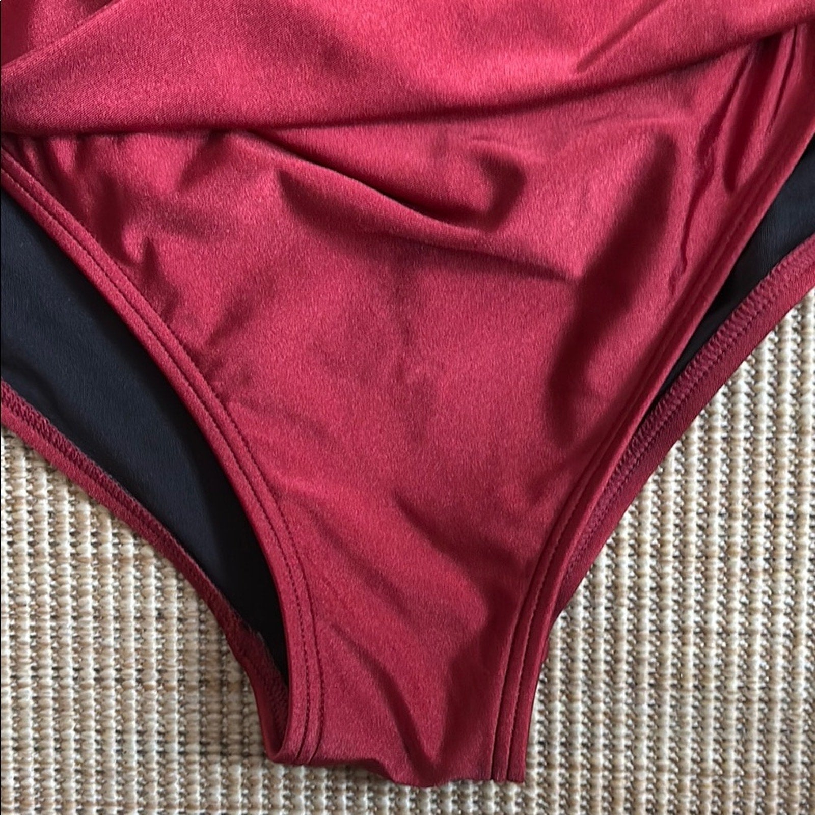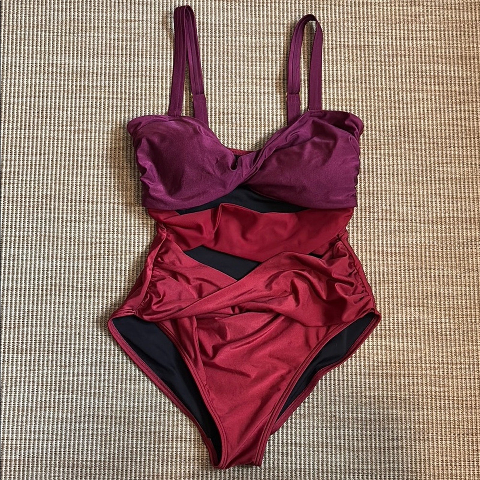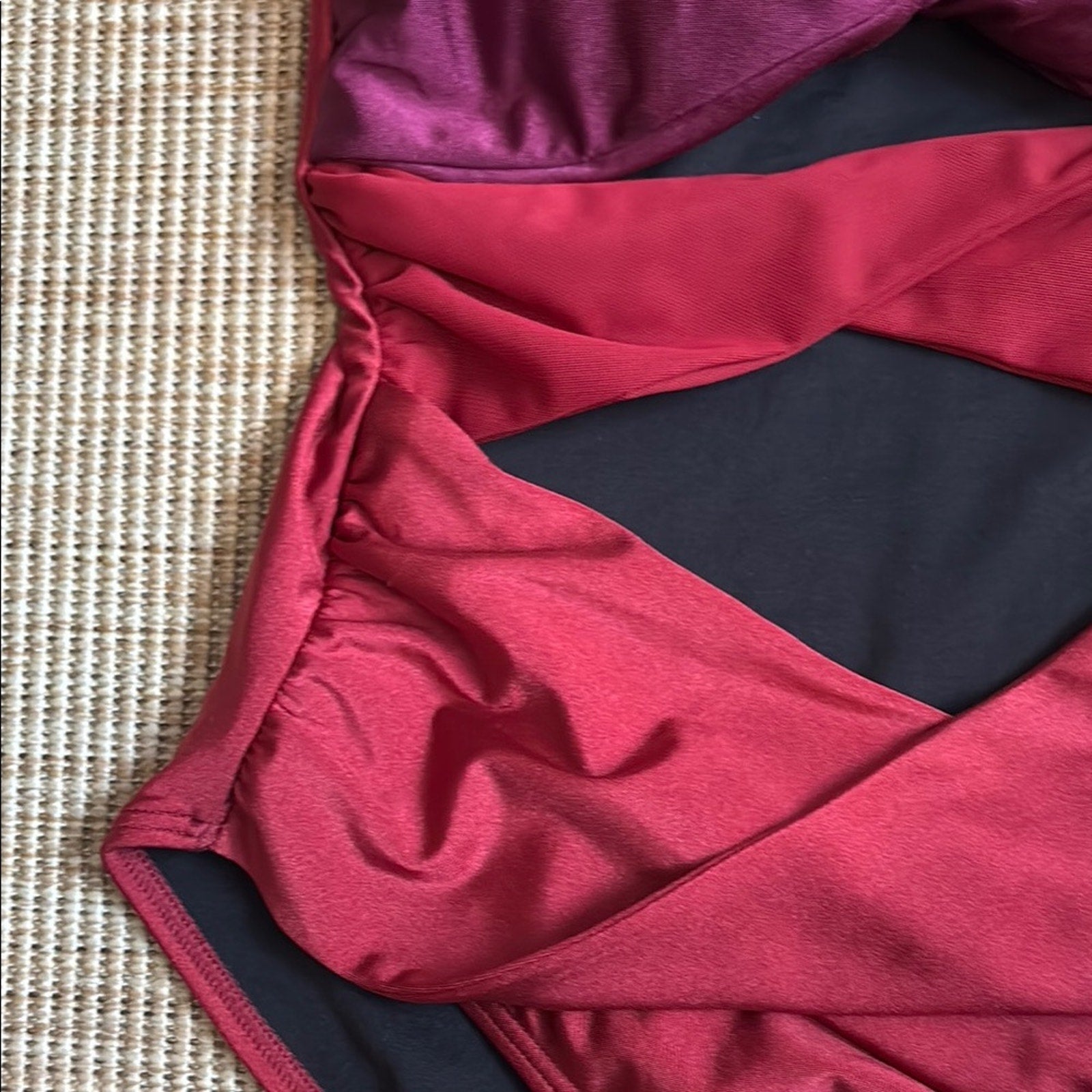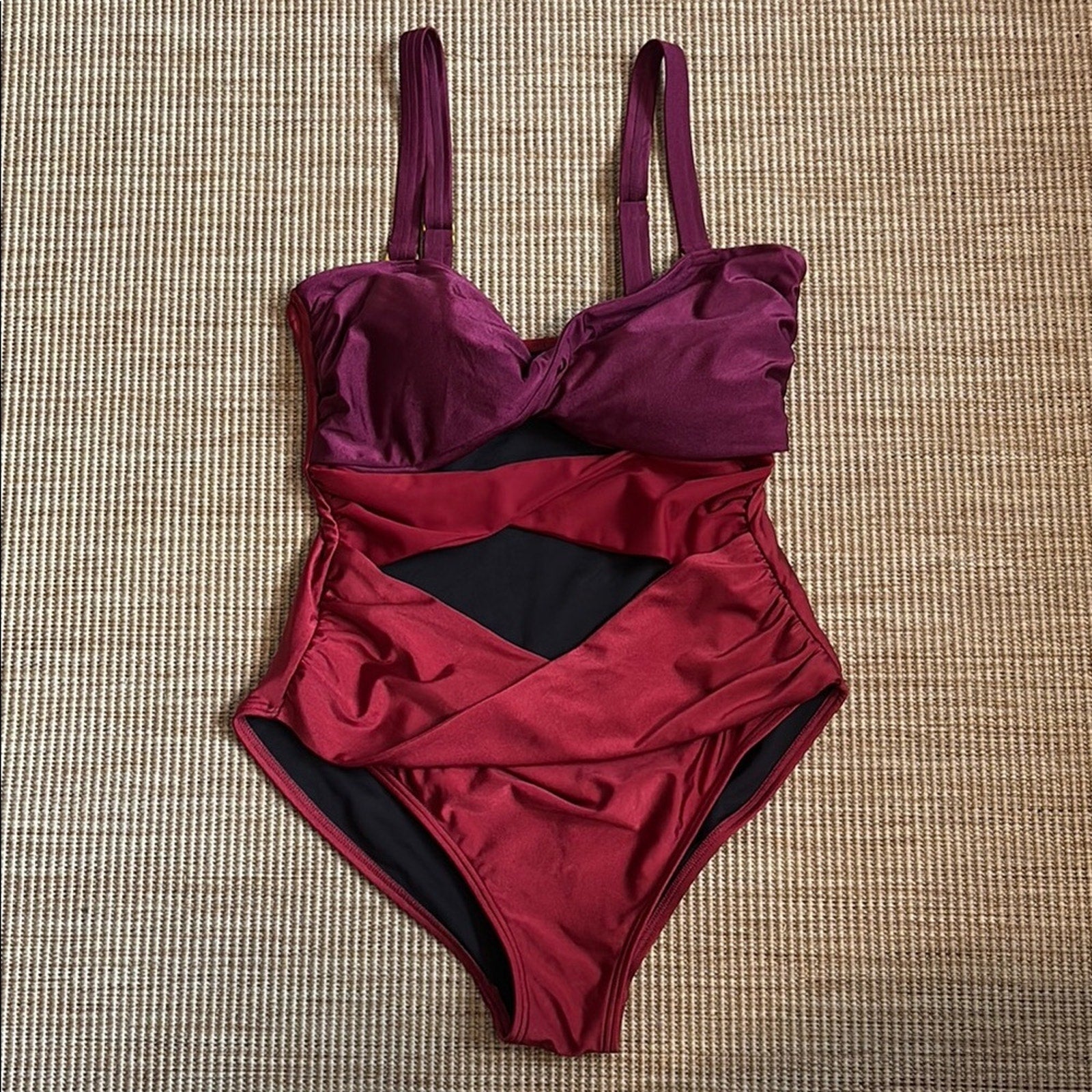 This REVOLVE one-piece swimsuit showcases a striking red and black color-blocked design, offering a chic and modern look. The structured bust area provides support, while the sleek silhouette is enhanced by subtle ruching details. Crafted from a glossy nylon/spandex blend, this swimsuit is perfect for making a statement at the pool or beach.