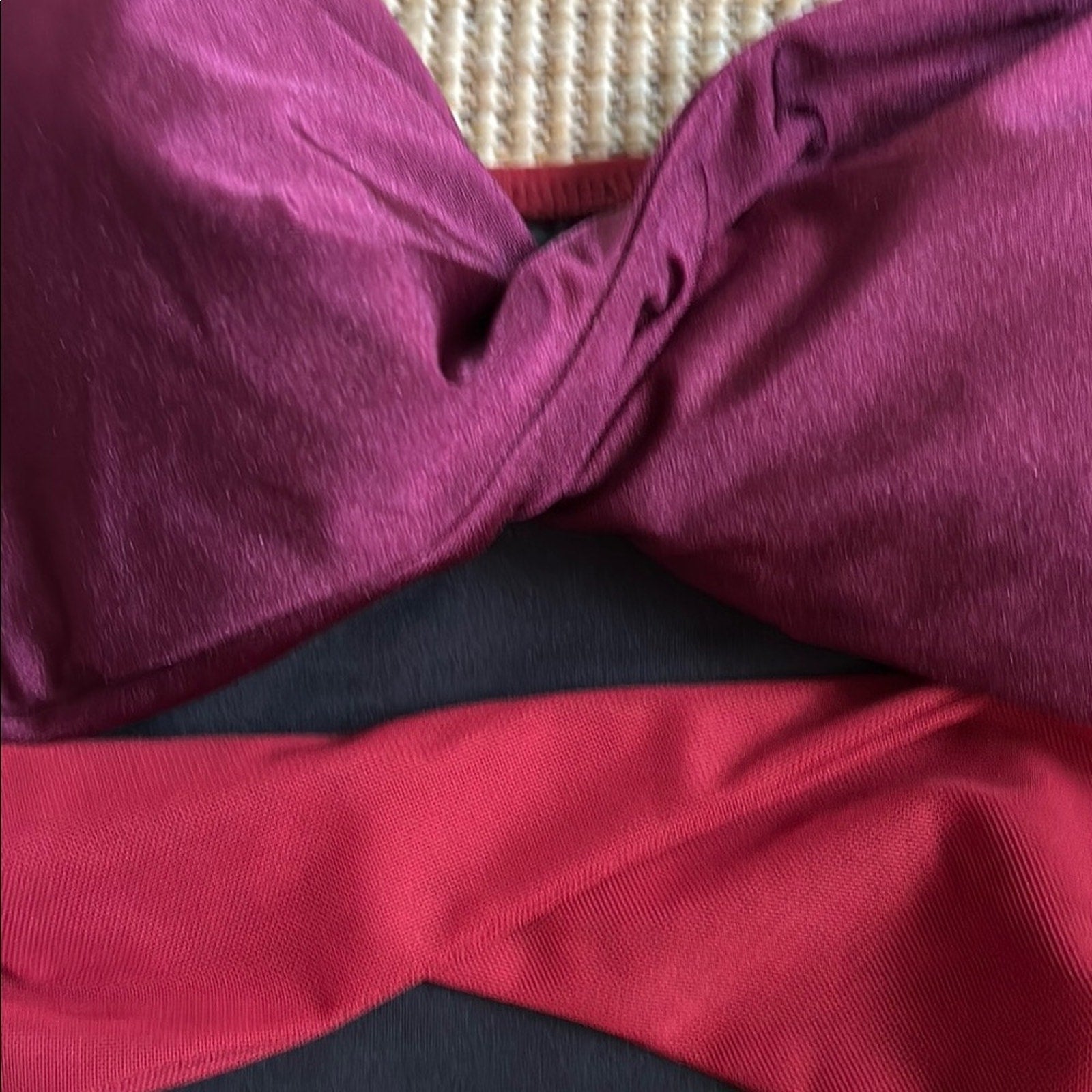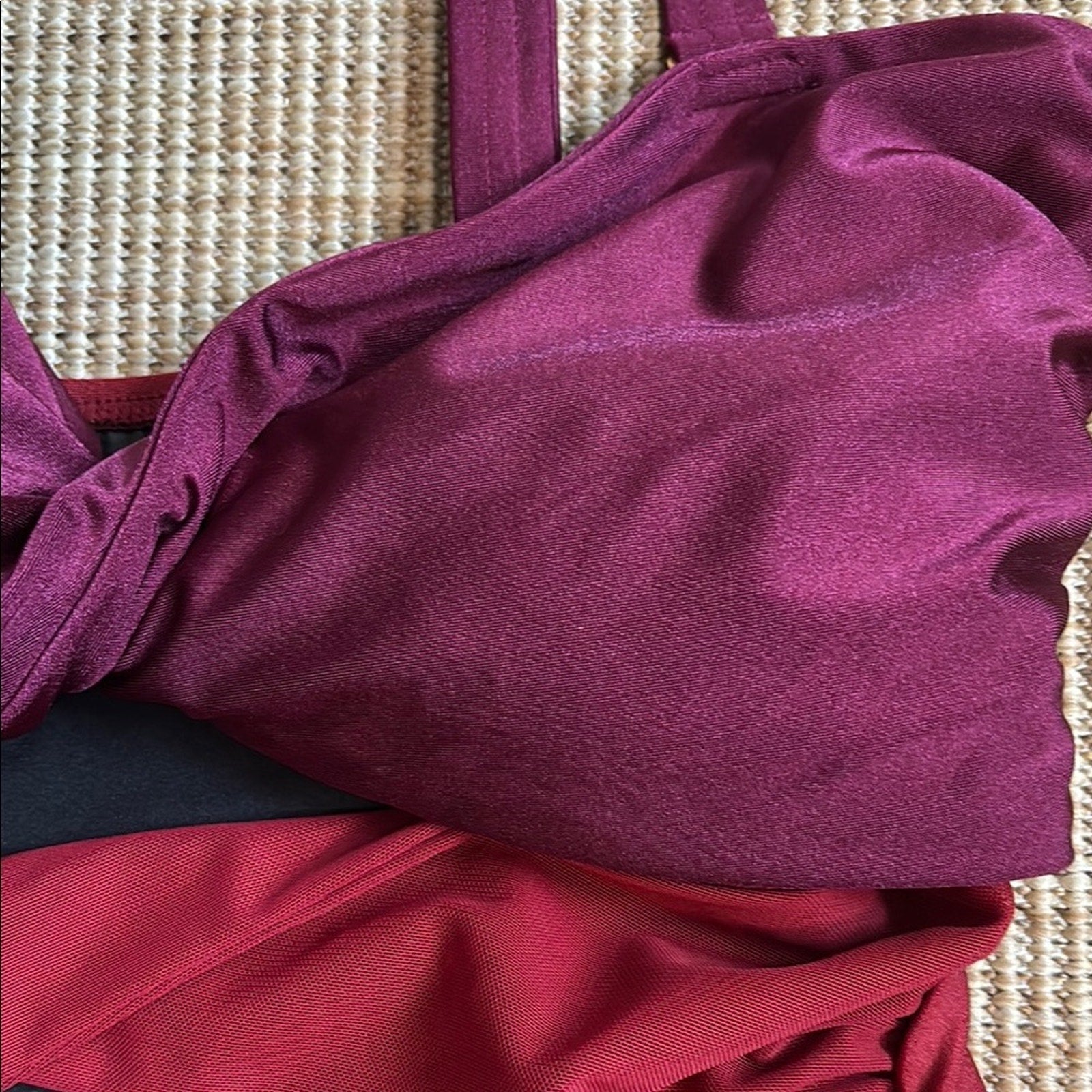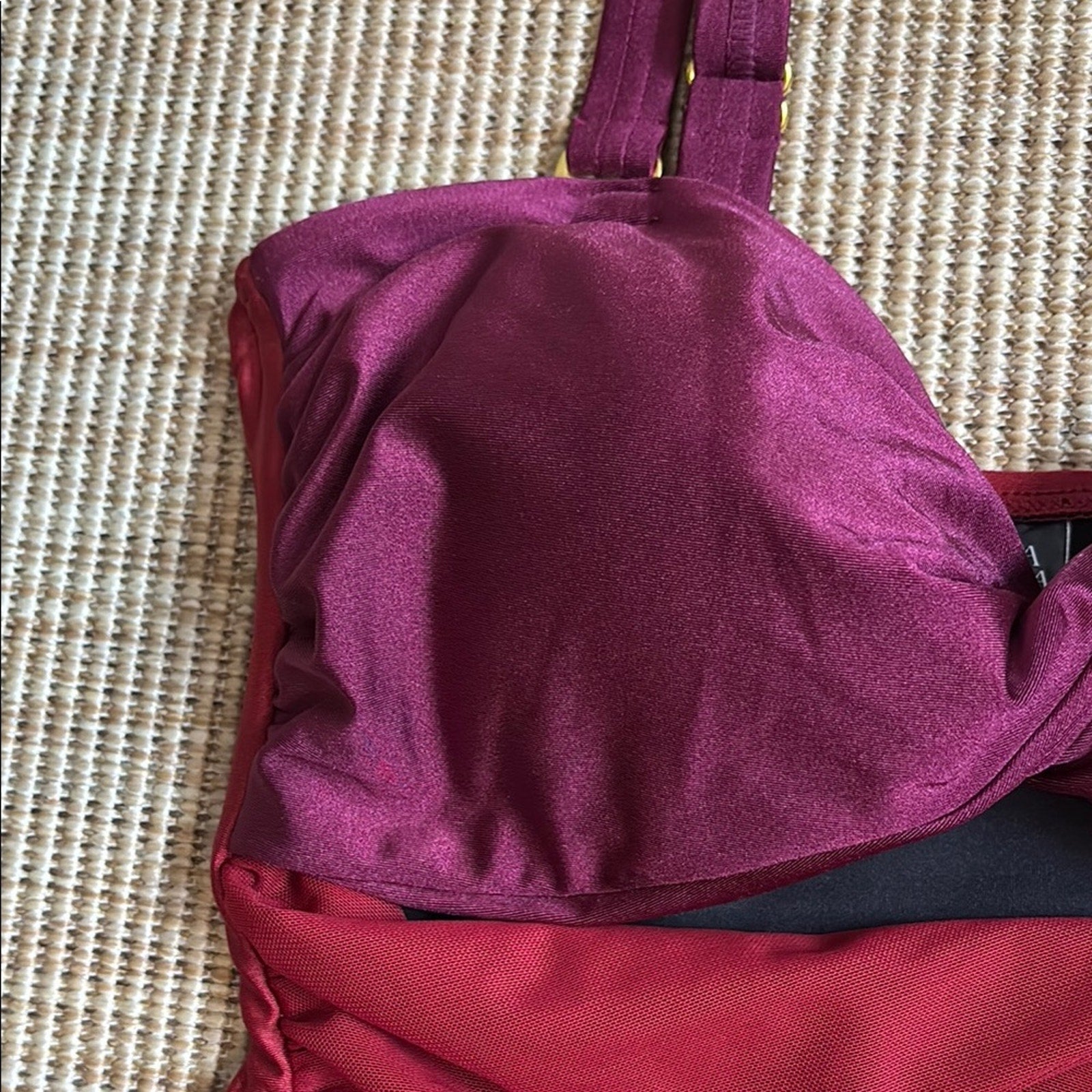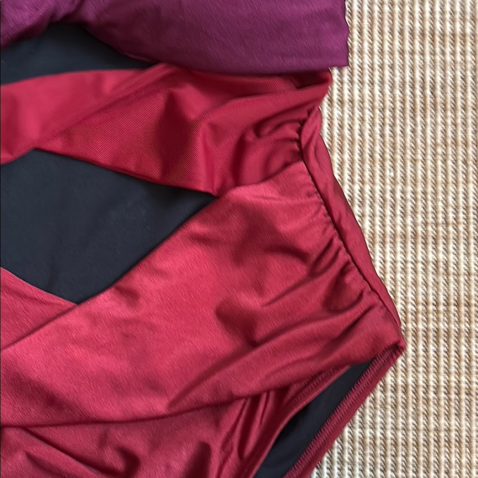 This REVOLVE one-piece swimsuit showcases a striking red and black color-blocked design, offering a chic and modern look. The structured bust area provides support, while the sleek silhouette is enhanced by subtle ruching details. Crafted from a glossy nylon/spandex blend, this swimsuit is perfect for making a statement at the pool or beach.